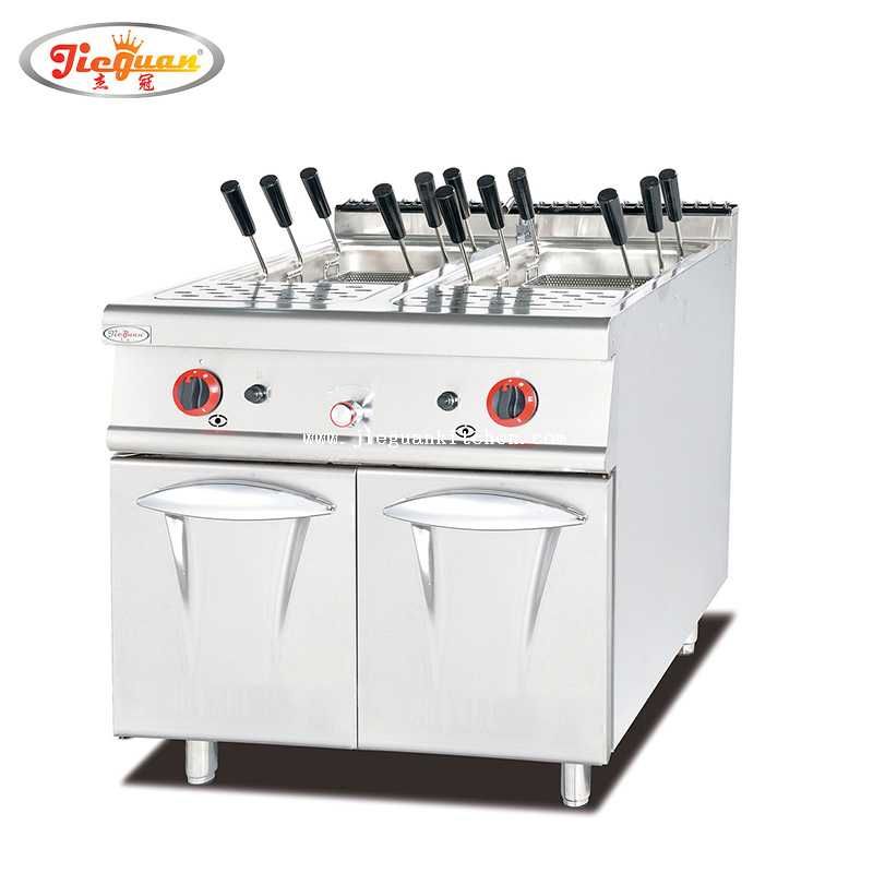 Un cuiseur à pâtes à gaz est une unité d'ébullition commerciale qui utilise des brûleurs à gaz pour chauffer l'eau rapidement. Les paniers permettent aux opérateurs de cuisiner des portions sur commande et de s'égoutter rapidement. La base de l'armoire ajoute du rangement et améliore l'organisation de la ligne.